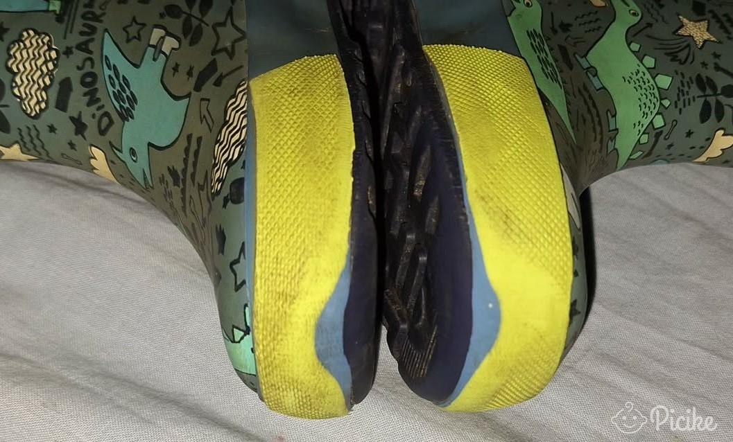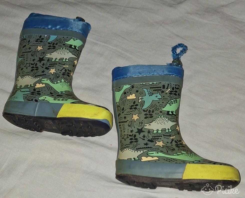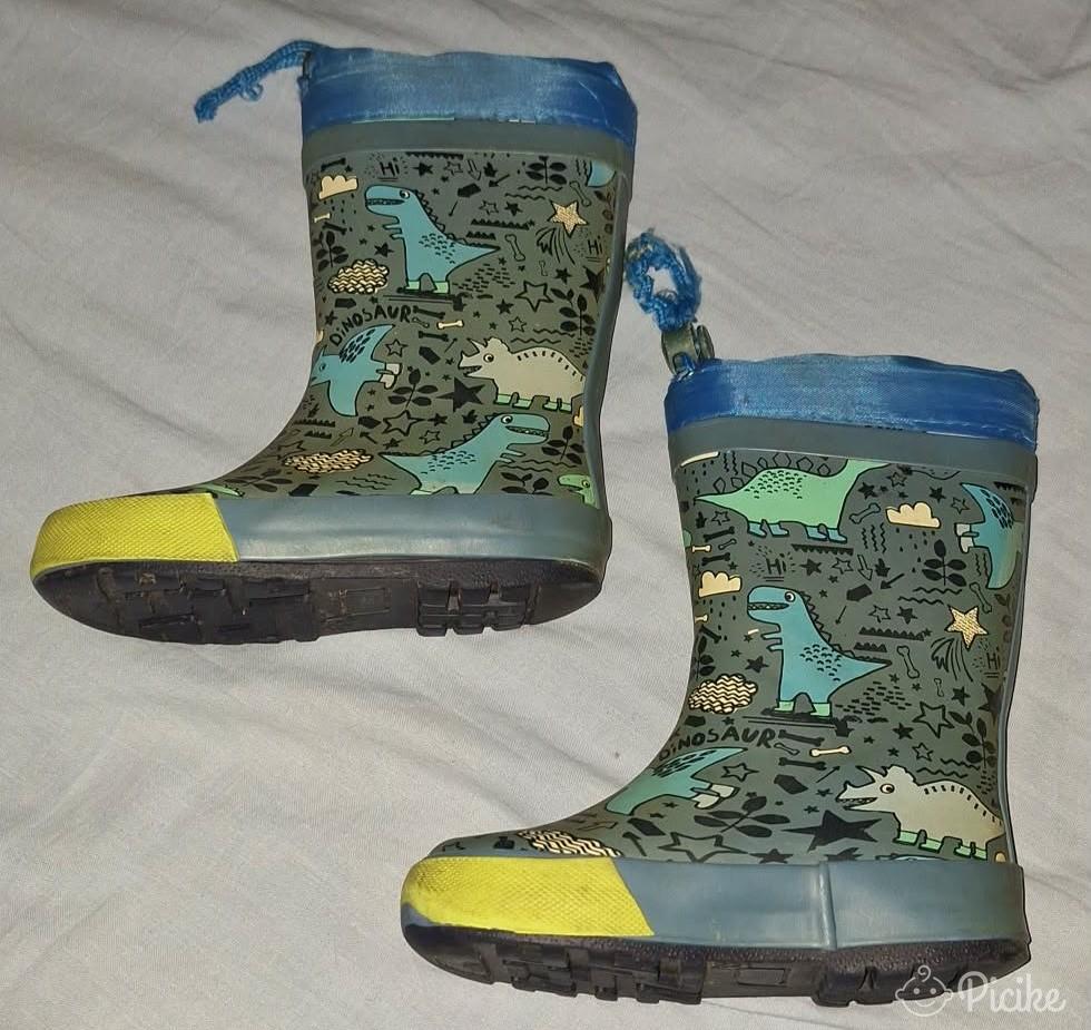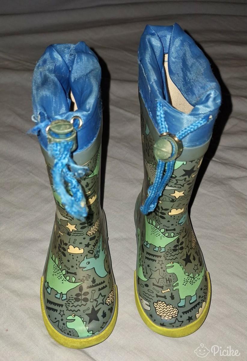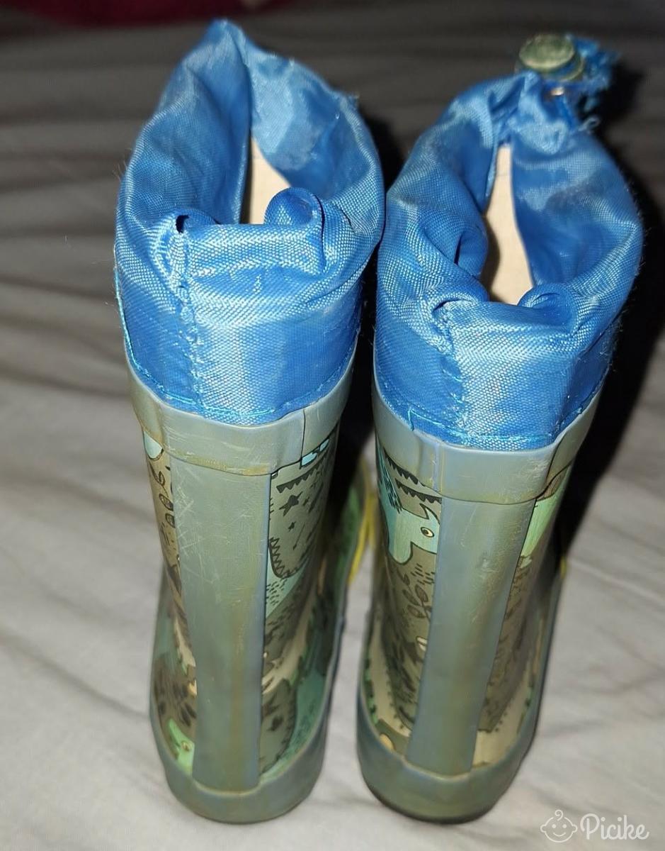 26os Cortina gumicsizma dínó mintával.Nem bélelt.A húzókájának a zsinórja már kicsit foszlik,de még egyben van.Az egyik nagyon közeli képen látható kopás van rajta.Rendszeresen volt sikálva,most is frissen mosva fotóztam,tehát ettől tisztább már nem lesz.Játszóra,oviba,kertbe,kirándulni még bőven jó.